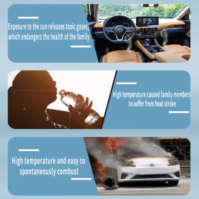 حماية المعدات في السيارة: سيزيد ضوء الشمس المباشر من درجة الحرارة في السيارة، مما قد لا يؤدي فقط إلى تسريع شيخوخة المواد في السيارة، بل يؤثر أيضًا على أداء القيادة الآمن للسيارة.يمكن لمظلة الشمس تجنب أشعة الشمس المباشرة وحماية لوحة العدادات والمقاعد والمعدات الأخرى في السيارة من التلف.