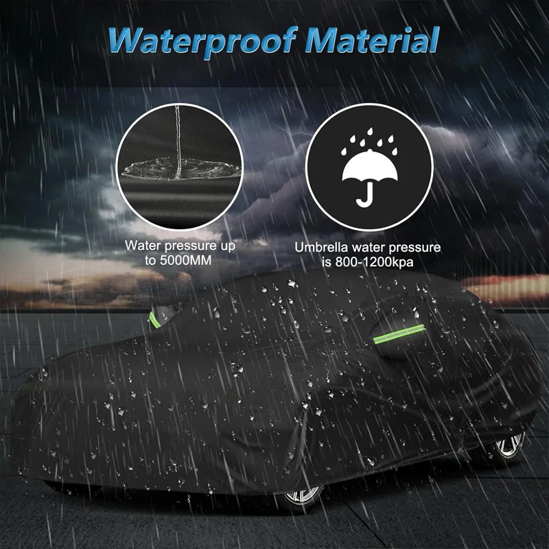 مادة مقاومة للماء: مع مقاومة ضغط الماء حتى 5000 مم (تتجاوز بكثير 800-1200 كيلو باسكال للمظلة)، فهي تحافظ على جفاف سيارتك في الأمطار الغزيرة.